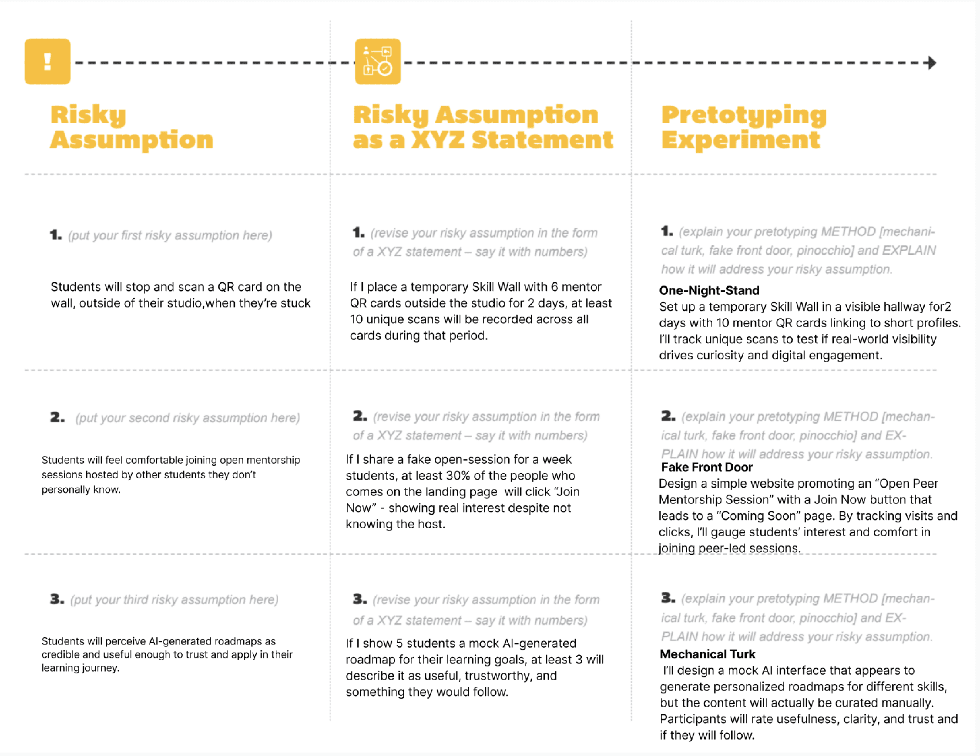 Every solution carries a set of assumptions—beliefs about how people will behave, what they will value, and how the system will fit into their everyday routines. Risky assumptions are the ones that matter most because they have not been proven yet and could impact the success of the project if they turn out to be wrong. In this mentorship system, several assumptions sit in this category: that students will adopt a new help-seeking pathway, that mentors will consistently update their availability, and that the combined physical–digital model will become part of the studio culture rather than an optional add-on.