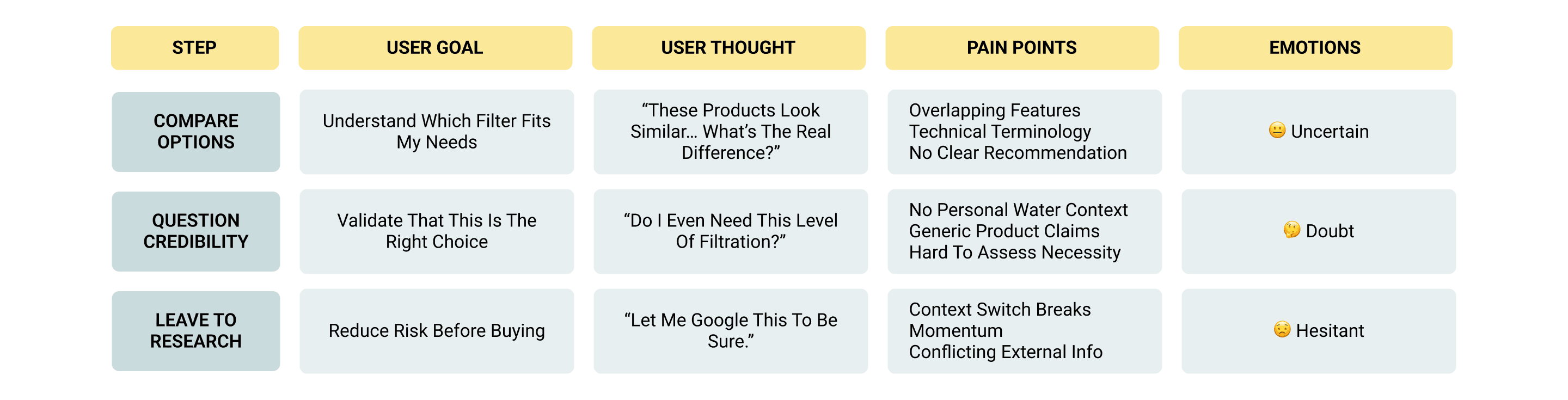 Before introducing solutions, we needed to understand where users were losing confidence during the decision process.